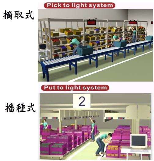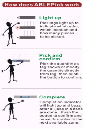 Pick on light picking method mostly applied on order picking. The operator could pick in faster pace according to the light signal from digital tag. Every label record the storage location of each item. The tag will display the picking amount. Press the button after the picking is finished. Without thinking, this method leads to a very high efficiency result.